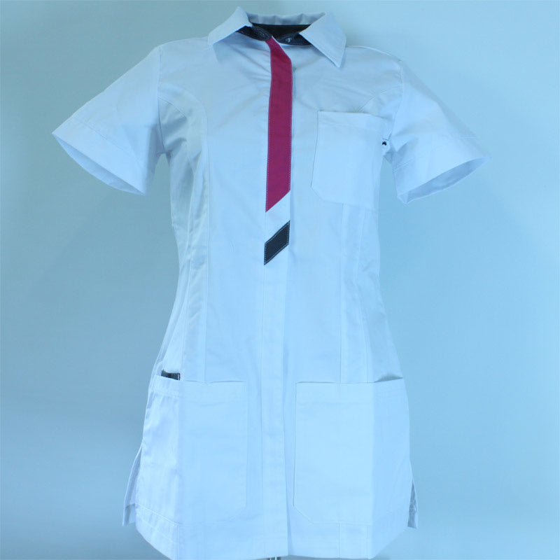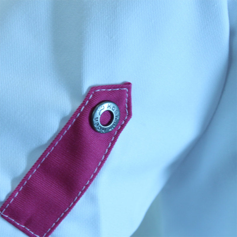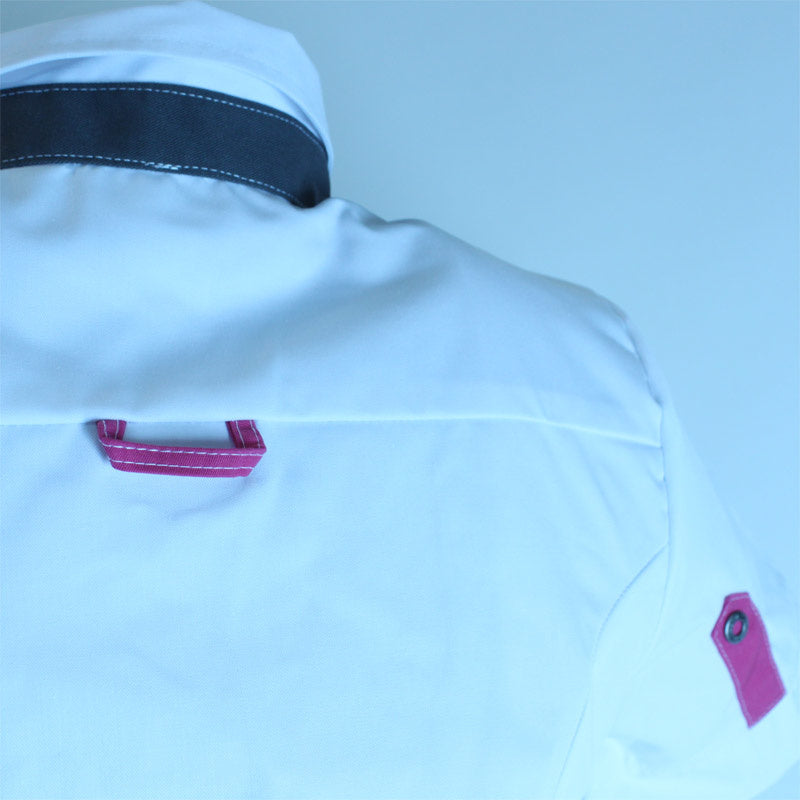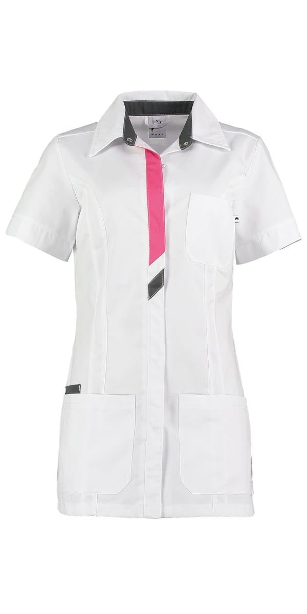 Het mooie fuchsia en grijze contrast zorgen voor de fleurige uitstraling van zorgjasje Peggy. De combinatie wit met fuchsia en grijs is aangebracht op verschillende plaatsen bij jasje Peggy. Zo vind je ze o.a. terug op de sluiting, subtiel op het zakje en in de kraag. Natuurlijk is het niet alleen belangrijk dat het jasje er mooi uit ziet. Het is een jasje om in te werken. Ook daarmee zit je goed met de aanschaf van jasje Peggy.